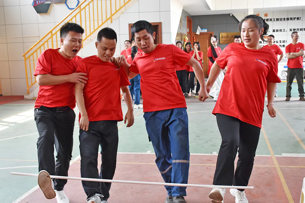 接下來的“勾肩搭腳”接力賽,堪稱爆笑名場(chǎng)面。四人一組或三人一組,搭肩并用一只腳面勾住接力桿前進(jìn)。這個(gè)項(xiàng)目不僅需要身體協(xié)調(diào),還考驗(yàn)團(tuán)隊(duì)成員間的步伐同步。有隊(duì)伍剛出發(fā)兩秒就集體“癱瘓”倒地,笑聲此起彼伏;也有團(tuán)隊(duì)?wèi){借高度默契和步伐節(jié)奏,一路高歌猛進(jìn),成為全場(chǎng)焦點(diǎn)。